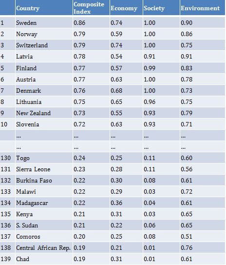 Chart 1 shows the numerical values of the Index of sustainability for the 139 countries for which it was possible to calculate it (for reasons of space we show only the first and last 10. Detailed results can be found in Carraro et al., 2015). The chart also includes the values of the sub-indexes calculated by aggregating separately the economic, social and environmental indicators.