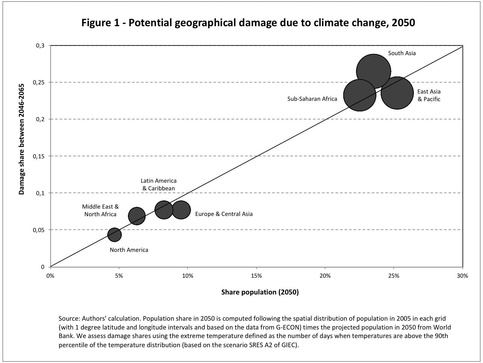 The lopsided distribution of expected damages across regions is evident in Figure 1, which illustrates potential damage due to climate change relative to population share by region. The 45° degree line separates regions with predicted damages greater (above the line) or lesser (below the line) than population shares.