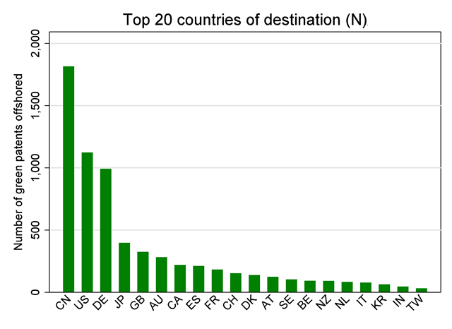 In a recent paper, we provide new empirical evidence on the geographic location of green R&D for a sample of 1,200 MNCs. Using information on inventors’ addresses as stated in firms’ green patents applications, we find that about 17% of our sample of patents have been developed by inventors overseas. China attracts the largest number of foreign green R&D patents, in particular in the field of energy-efficient lightings, solar and wind technologies. Not only General Motors but also Philips and Vestas, respectively leaders in lightings and wind technologies, have nowadays R&D laboratories located in China. For the rest, most of the top-20 destination of foreign green R&D activities by MNCs are composed of OECD countries (see Figure 1), with India and Taiwan entering in the last positions.