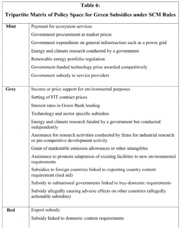 To bolster public understanding about the potentials for green growth, the study provides a chart that places environmental subsidies into three colored categories: mint (permitted), red (disallowed), and grey (contingent status). WTO rules seek to prevent the red area subsidies, which are by design discriminatory or trade distorting, and grey area subsidies when they cause adverse effects. This chart, therefore, serves to assist governments in crafting subsidies in a way that minimizes trade distortions, and minimizes the likelihood that the subsidies will be found in violation of WTO rules. The chart, contained in Table 6 of the paper, is shown below.