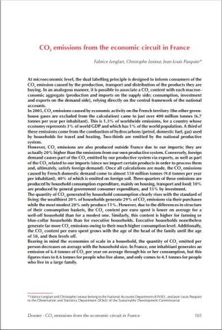 The report also provides some insight into household-level emissions patterns relative to the standard of living and household size. Specifically, it finds that the quantity of CO2 generated by household consumption clearly rises with the standard of living, as the wealthiest 20 percent of households generate 29 percent of CO2 emissions via their purchases, while the most modest 20 percent only produce 11 percent of CO2 emissions. However, due to the differences in structure of their consumption baskets, the CO2 content per Euro spent is lower on average for a well-off household than for a modest one. As for household size, bearing in mind the economies of scale in a household, the quantity of CO2 emitted per person decreases on average with the household size. One inhabitant is calculated to generate emissions of 6.4 tonnes of CO2 per year through their consumption, but this figure rises to 8.6 tonnes for people in a single household, and only amounts to 4.1 tonnes for people living in a large family.