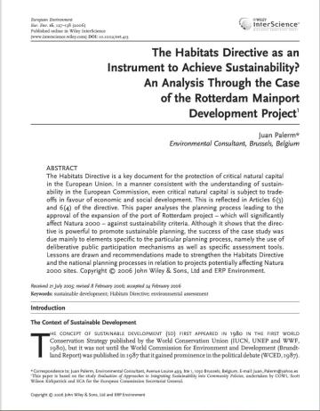 This paper analyses the planning process leading to the approval of the expansion of the port of Rotterdam project in the Netherlands against sustainability criteria. Although it shows that the directive is powerful to promote sustainable planning, the success of the case study was due mainly to elements specific to the particular planning process, namely the use of deliberative public participation mechanisms as well as specific assessment tools. Lessons are drawn and recommendations made to strengthen the Habitats Directive and the national planning processes in relation to projects potentially affecting Natura 2000 sites.