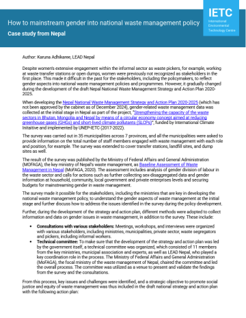 The lessons learned by each speaker are compiled in a case study for each country. These case studies offer practical insights and examples of how gender considerations have been effectively integrated into national waste management policies across diverse regional contexts, providing valuable guidance for policymakers and practitioners aiming to advance gender-responsive waste management.