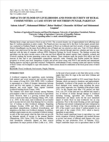 This study, conducted in Southern Punjab province, explores the impacts of a massive flood in 2010 on the livelihoods and food security of rural communities. The disaster was of unprecedented level, affecting more than 20.1 million population in Pakistan, especially in the district Muzaffargarh, which was selected as the study area. A total of 120 flood affected people were interviewed.