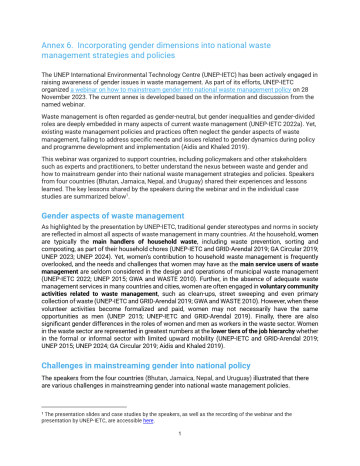 This annex highlights the importance of integrating gender considerations into national waste management strategies and policies. Based on a UNEP-IETC webinar held in November 2023, it reveals how women are often central to household and informal waste management but are underrepresented in decision-making and formal employment in the sector. The document outlines common challenges—such as lack of data, funding, and awareness—and shares lessons from Bhutan, Jamaica, Nepal, and Uruguay on how to overcome these barriers. Key success factors include collecting sex-disaggregated data, ensuring inclusive stakeholder consultations, building partnerships with gender experts, and establishing gender-sensitive monitoring systems.