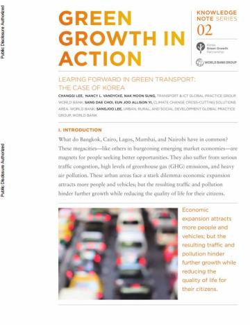 Big cities in developing countries are centers of economic growth, and magnets for people seeking better opportunities. That is the good part. The bad part is that the resulting population increases and economic growth come with traffic congestion, higher greenhouse gas emissions, and heavy pollution. Not long ago, Korean cities suffered from similar problems, but a combination of government policies, reforms, “demand-side” approaches, and innovative financing schemes helped turned congested urban roadways into mass transit-oriented cities, while reducing greenhouse gases and improving the lives of citizens. Leaping Forward in Green Transport: The Case of Korea—the Korean Green Growth Partnership’s (KGGP) Knowledge Note number 2—explains Korea’s approach to “Green” transport, and offers compelling lessons for other emerging economies.