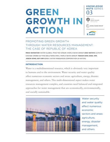 Water security and water quality affect numerous economic sectors and areas: agriculture, energy, disaster management, and others. Countries need balanced and integrated approaches that are economically, environmentally, and socially sustainable. Threats related to climate change have added to the complexity, and to the importance, of water resource management. Korea’s integrated water resources management approach since the 1990s reflects the country’s “green” climate-resilient development path. The Korean Green Growth Trust Fund’s (KGGTF) 3rd “Knowledge Note”, Promoting Green Growth through Water Resources Management: the Case of Republic of Korea, outlines key responses to Korea’s water resource challenges. The report highlights the Korean Government’s “Four Major River Restoration Project (4MRRP)”, a multi-purpose, green-growth infrastructure initiative. Involving five ministries and 78 local authorities in a comprehensive and integrated approach, the Note showcases lessons from 4MRRP for other countries to learn from Korea’s experience overcoming institutional, legislative, governance, technical and financial hurdles.