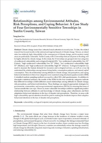 This study examines the relationships among attitudes to climate change, risk perceptions, and coping behavioral intentions in different townships of Yunlin County in Taiwan, which has relatively high vulnerability to the consequences of climate change.