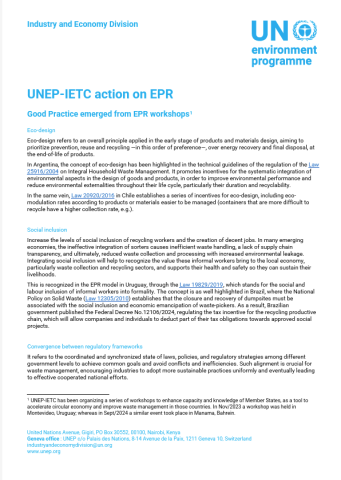 UNEP-IETC has been actively supporting countries in advancing Extended Producer Responsibility (EPR) systems through regional workshops and knowledge-sharing efforts. Key good practices emerging from these initiatives include promoting eco-design, as seen in Argentina and Chile, where regulations incentivize environmentally responsible product design to improve recyclability and reduce waste. Social inclusion is emphasized in Uruguay and Brazil through laws that integrate informal waste workers into formal systems, enhancing livelihoods and waste management efficiency. The importance of regulatory convergence is highlighted to ensure harmonized waste policies across government levels, improving coordination and outcomes. Countries like Jordan have demonstrated the value of collaborative stakeholder engagement, taking several years to build consensus around EPR rollout. Saudi Arabia further exemplifies this by aligning EPR development with its Vision 2030 goals through broad stakeholder participation. These experiences underscore the importance of inclusive, well-coordinated approaches for effective EPR implementation globally.