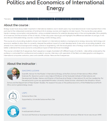 This course aims at providing students whose main interest is in international relations a background on energy resources, technology and economic realities to allow them to correctly interpret the political impact of current developments. It also aims at providing students, who already have a technical background in energy science or engineering, with the broad global view of energy issues that will allow them to better understand the social, economic and political impact of their technical knowledge. The course syllabus consists of: