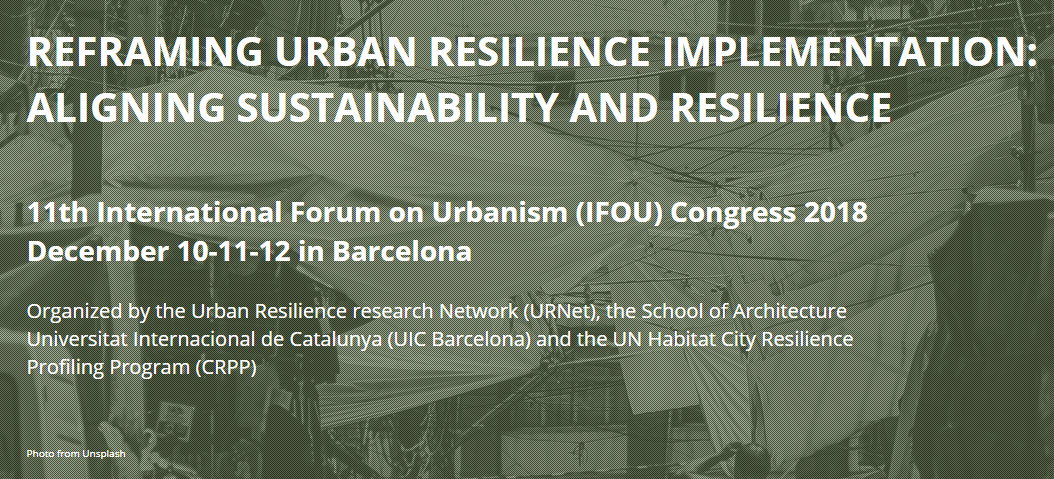 On 10-12 December 2018, the Urban Resilience research Network (URNet), the School of Architecture Universitat Internacional de Catalunya (UIC Barcelona) and the UN Habitat City Resilience Profiling Program (CRPP) are hosting the 11th International Forum on Urbanism (IFOU) Congress 2018, Reframing Urban Resilience Implementation: Aligning Sustainability and Resilience in Barcelona, Spain.