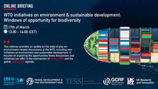 On 17 March 2022 (12:00-13:00 CMT), UNEP and the Trade, Development and the Environment Hub (GCRF TRADE Hub) are hosting the briefing WTO initiatives on environment & sustainable development: Windows of opportunity for biodiversity.