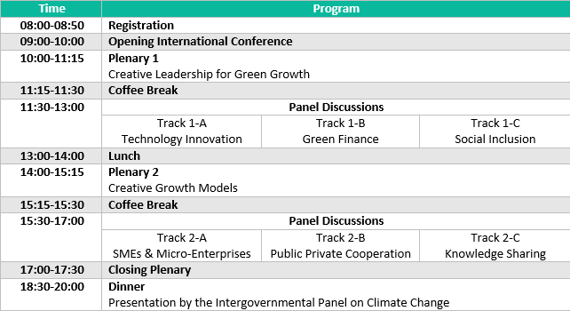 Discussions will center around three key drivers of green growth and creative economy:technology, finance, and inclusiveness. This conference will provide an interactive arena for holistic discussions among participants from the public sector, private businesses, and civil society. It will also feature creative and innovative business models in green industry as a showcase for the nexus between green growth and creative economy.