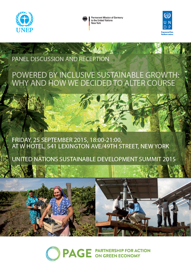 At this event, a Panel Discussion And Reception, the panellists will explore ideas and options for: 1) creating opportunities and triggering change for more inclusive and greener growth, especially in the context of the SDGs, 2) mobilizing investment and financing at scale, 3) ensuring equitable benefits for all from transition to greener and more inclusive economies, and 4) strengthening advisory mechanisms, networks and partnerships, such as the Partnership for Action on Green Economy (PAGE) and the Poverty-Environment Initiative (PEI), among others, that can support countries in reframing economic policies and practices around sustainability.