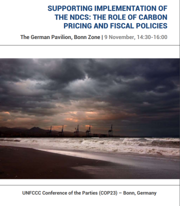 On 9 November 2017 from 14:30-16:00, the Green Fiscal Policy Network together with Deutsche Gesellschaft für Internationale Zusammenarbeit (GIZ) GmbH and the German Federal Ministry for the Environment, Nature Conservation, Building and Nuclear Safety is hosting the side event Supporting Implementation of the NDCs: The Role of Carbon Pricing and Fiscal Policies at COP23 in Bonn.