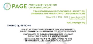 On 16 July 2018, the Partnership for Action on Green Economy (PAGE) is hosting Transforming our Economies and Lifestyles: Greener & Fairer for Future Generations in NYC, New York, United States.