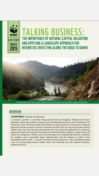 This case study reflects on a WWF Green Economy Modelling report conducted in 2013 ‘Green Economy Modelling of Ecosystem Services in the Dawna Tenasserim Landscape (DTL) along the ‘Road to Dawei’, which looked specifically at the sustainable transport infrastructure options within this landscape which straddles both Thailand and Myanmar. The case study provides a summary of the analysis and results from the report, including the projections generated up to 2035 that analyze the short, medium and longer-term consequences of road construction and from these, how a green economy approach over a business as usual approach is not only the most sustainable choice, but also the more economical choice in the long term, that helps healthy economies and societies to grow.