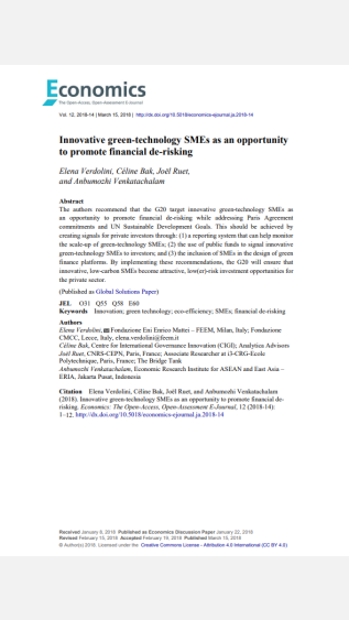 In this paper, Innovative Green-Technology SMEs as an Opportunity to Promote Financial De-Risking, the authors recommend that the G20 target innovative green-technology SMEs as an opportunity to promote financial de-risking while addressing Paris Agreement commitments and UN Sustainable Development Goals.