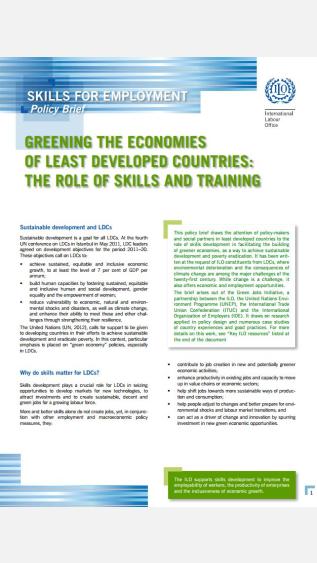 This policy brief draws the attention of policy-makers and social partners in least developed countries to the role of skills development in facilitating the building of greener economies, as a way to achieve sustainable development and poverty eradication. It has been written at the request of ILO constituents from LDCs, where environmental deterioration and the consequences of climate change are among the major challenges of the twenty-first century. While change is a challenge, it also offers economic and employment opportunities. The brief arises out of the Green Jobs Initiative, a partnership between the ILO, the United Nations Environment Programme (UNEP), the International Trade Union Confederation (ITUC) and the International Organization of Employers (IOE). It draws on research applied in policy design and numerous case studies of country experiences and good practices.