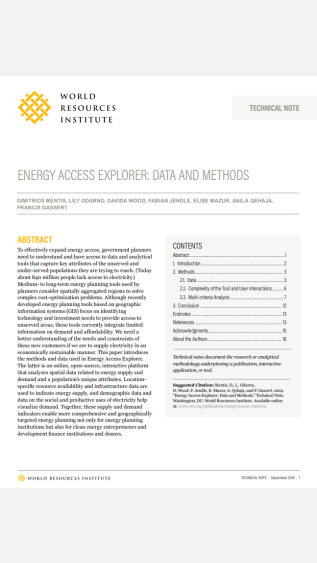 This paper introduces the methods and data used in Energy Access Explorer, an online, open-source, interactive platform that analyzes spatial data related to energy supply and demand and a population’s unique attributes. The Energy Access Explorer also incorporates demographic data and data on social and productive uses to visualize demand for energy services. Together, these supply and demand indicators enable more comprehensive energy planning.