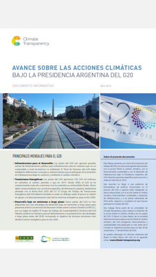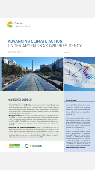 This briefing paper, Advancing Climate Action Under Argentina's G20 Presidency, provides an overview of the G20 working structure and agenda items relating to climate action, sustainable finance and infrastructure development under Argentina’s G20 Presidency. It presents specific options for G20 action and ambition in 2018.