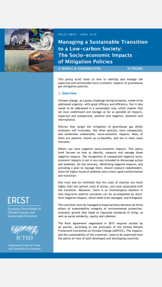 The Managing a Sustainable Transition to a Low-carbon Society: The socio-economic impacts of mitigation policies policy brief looks at how to identify and manage the expected and unintended socio-economic impacts of greenhouse gas (GHG) mitigation policies.
