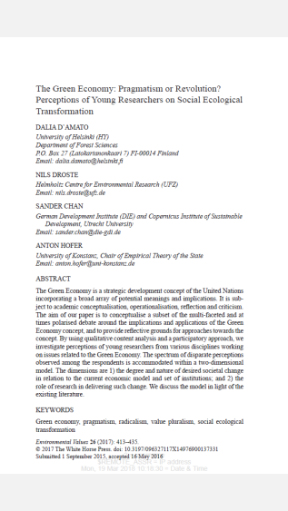 By using qualitative content analysis and a participatory approach, the paper The Green Economy: Pragmatism or Revolution? Perceptions of Young Researchers on Social Ecological Transformation investigate perceptions of young researchers from various disciplines working on issues related to the Green Economy.
