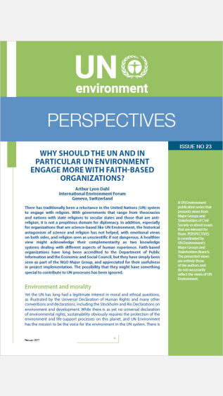 There has traditionally been a reluctance in the United Nations (UN) system to engage with religion. With governments that range from theocracies and nations with state religions to secular states and those that are antireligion, it is not a propitious domain for diplomacy. In addition, especially for organizations that are science-based like UN Environment, the historical antagonism of science and religion has not helped, with emotional views on both sides, and religion seen as unscientific if not dangerous.