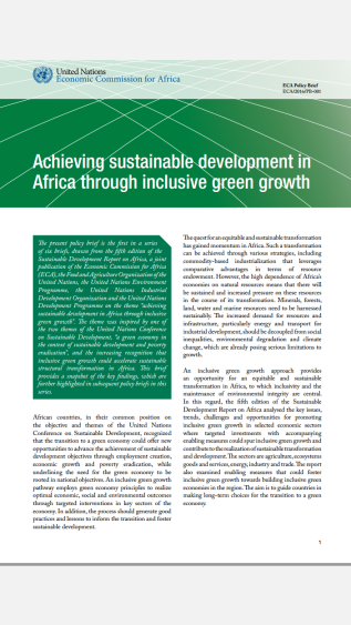This is the first in a series of six briefs, drawn from Achieving Sustainable Development in Africa through Inclusive Green Growth, a joint publication of the Economic Commission for Africa (UNECA), the Food and Agriculture Organization of the United Nations, the United Nations Industrial Development Organization and the United Nations Development Programme on the theme of "achieving sustainable development in Africa through inclusive green growth". This brief provides a snapshot of the key findings, which are further highlighted in subsequent policy briefs in this series.