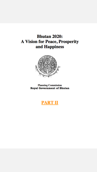Bhutan 2020: A vision for peace, prosperity and happiness II prioritizes the future and sets out the main directions that enable the nation to mainatin its distinctive path of development in the next century. It identifies a hierarchy of goals, objectives and principles and presents the central development concept that is essential for understanding the distinctive approach to development.