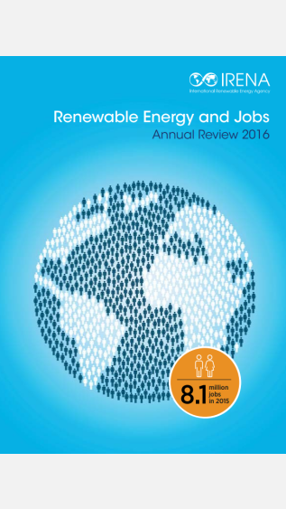 Renewable Energy and Jobs – Annual Review 2016 presents the status of renewable energy employment, both by technology and in selected countries, over the past year. In this third edition, IRENA estimates that renewable energy employed 8.1 million people around the world in 2015 (excluding large hydropower). This is a 5% increase from the number reported the previous year. In addition, IRENA conducted a second global estimate of large hydropower employment, showing approximately 1.3 million direct jobs in the sector.