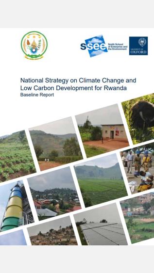 This Baseline Report is the first step in the process of developing a National Strategy on Climate Change and Low Carbon Development for Rwanda. It provides a snapshot of the country today and the planned initiatives that will take it forward, placing it within the context of climate change. Though many opportunities are highlighted, the aim of the report is to provide the foundation for the next step where detailed analysis will take place and recommendations will be made. It includes an analysis of the following sectors: climate policy; economy, trade and industry; energy; mining; transport; cities and the built environment; agriculture; land; water and forestry.