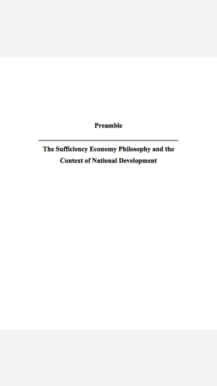 The Tenth National Economic and Social Development Plan aims to pursue a green and happiness society under the direction of the sufficiency economy philosophy. The mission of the Tenth plan is to enhance the efficient economy, conserve biodiversity and build a secure natural resource base, increase capabiity of people to achieve self-reliance through knowledge, good health and strong communitites and improve the national administration with strong governance and democracy with the king as the head of the state.