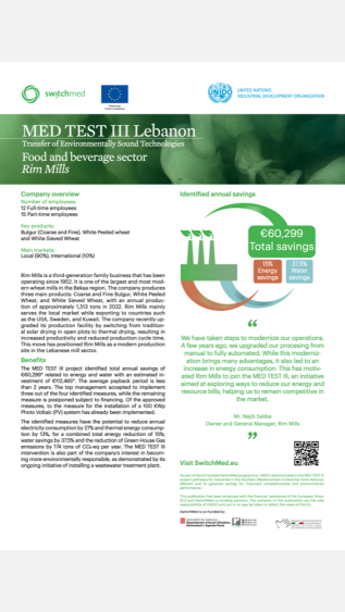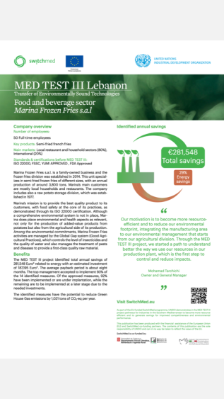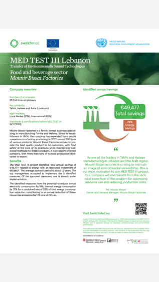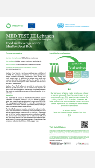 This case study examines the economic and environmental benefits of adopting more efficient and cleaner ways of producing food in a Lebanese company. It guides the process using a specific method, the TEST methodology, developed by UNIDO.
