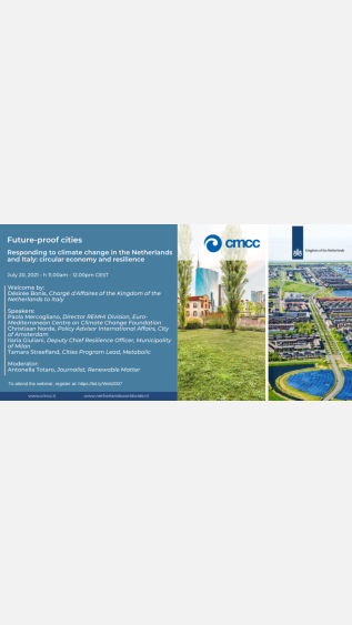 On 20 July 2021, the Euro-Mediterranean Centre on Climate Change is hosting the webinar "Future-proof Cities. Responding to Climate Change in the Netherlands and Italy: Circular Economy and Resilience".