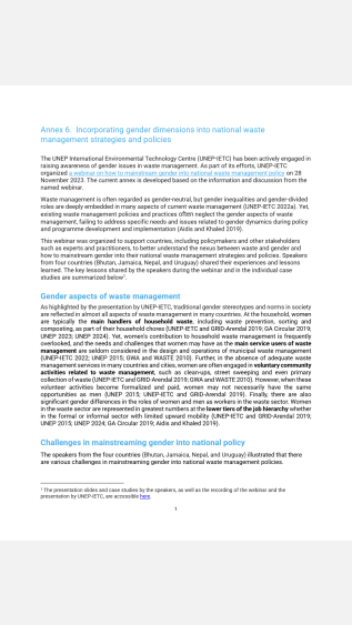 This annex emphasizes the need to integrate gender into waste management policies, as women’s roles are often overlooked despite their key contributions. Drawing on a UNEP-IETC webinar and country cases from Bhutan, Jamaica, Nepal, and Uruguay, it highlights challenges like lack of data and awareness, and shares strategies such as inclusive consultations, gender data collection, and partnerships with gender experts.