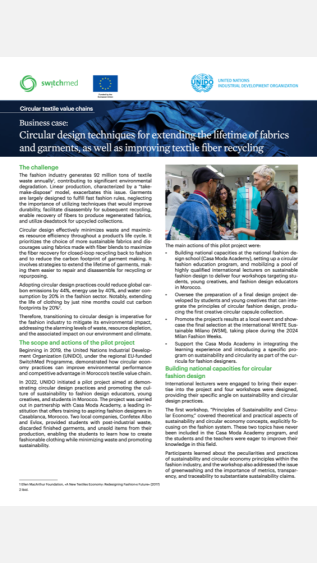 This case study documents the practices and processes learned by students at the Casa Moda Academy in Casablanca, where they were taught the fundamentals of circular design to develop sustainable fashion products from pre-consumer textile waste as part of a UNIDO project.