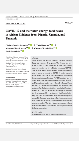 Therefore, this study aims to assess the impacts of COVID-19 on the access to water, energy, and food as well as to identify innovations in water sanitation and hygiene (WASH) practices and examine the current policy interventions in Nigeria, Uganda, and Tanzania.