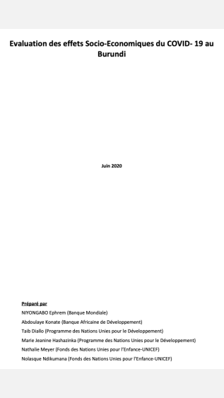 As the technical lead for the socio-economic response, UNDP and its country offices worldwide are working to assess the socio-economic impacts of the COVID-19 pandemic on economies and communities. This report contains the preliminary findings of the socio-economic assessment conducted for Burundi.