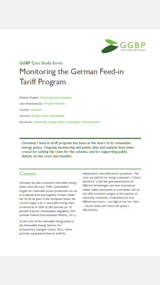 Germany’s feed-in tariff program has been at the heart of its renewable energy policy. Ongoing monitoring and public data and analysis have been crucial for setting the rates for the scheme, and for supporting public debate on the costs and benefits.