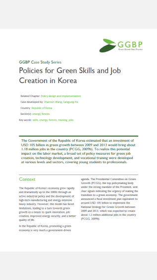 The Government of the Republic of Korea estimated that an investment of USD 105 billion in green growth between 2009 and 2013 would bring about 1.18 million jobs in the country (PCGG, 2009b).