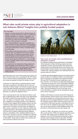 There is growing interest in the role that private finance could play in supporting agricultural adaptation in sub-Saharan Africa. This discussion brief What Roles Could Private Actors Play in Agricultural Adaptation in Sub-Saharan Africa? Insights from Publicly Funded Projects examines the role of private actors in publicly funded agricultural adaptation projects in this region.