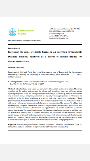 The paper Increasing the Value of Climate Finance in An Uncertain Environment: Diaspora Financial Resources as a Source of Climate Finance for Sub-Saharan Africa undertook an analysis of project reports, policy reviews, policy briefs, and academic literature reviews on the barriers and opportunities for private investments in climate change programmes.