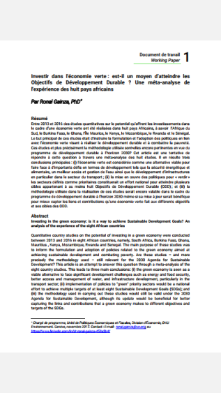 Quantitative country studies on the potential of investing in a green economy were conducted between 2013 and 2016 in eight African countries, namely, South Africa, Burkina Faso, Ghana, Mauritius , Kenya, Mozambique, Rwanda and Senegal.