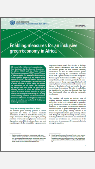 This policy brief outlines the role and significance of various enablers that could facilitate a smooth transition to green economy in Africa, taking into account the implications for the region and highlights key messages that could inform the application of enabling measures in Africa for optimal policy impacts. It concludes that the transition to a green economy will not happen automatically; and creating certain ‘enabling’ conditions will provide incentives for various stakeholders, including public and private actors, to invest in, and contribute to building an inclusive green economy.
