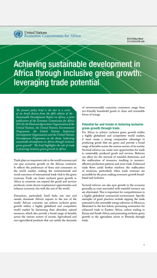 This policy brief is the last in a series of six briefs, drawn from Achieving Sustainable Development in Africa through Inclusive Green Growth, a joint publication of the Economic Commission for Africa (UNECA), the Food and Agriculture Organization of the United Nations, the United Nations Industrial Development Organization and the United Nations Development Programme on the theme of "achieving sustainable development in Africa through inclusive green growth". Specifically, this policy brief looks at the potential to leverage trade in achieving green growth as trade plays an important role in the world economy and can spur economic gorwth on teh African continent. It recognised that while extractives, particularly fossil fuels, raw ores and metals, dominate Africa’s exports to the rest of the world, African countries can achieve inclusive green growth within a highly globalized and competitiven world market by harnessing their abundant natural resources, which also provide a broad range of benefits across the various sectors of society.