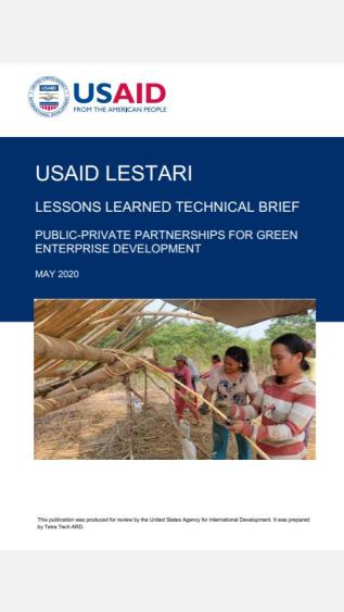 USAID LESTARI partners with the Government of Indonesia (GOI) to reduce greenhouse gas (GHG) emissions and conserve biodiversity in carbon rich and biologically significant forest and mangrove ecosystems. This brief focuses on supporting Green Enterprises to enhance sustainable livelihood opportunities for local communities, including a summary of the initiatives that were undertaken, the main outcomes and impacts, and the key lessons learned from 5 years of implementation.