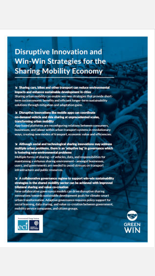 This policy brief, Disruptive Innovation and Win-Win Strategies for the Sharing Mobility Economy, published as part of the Green-Win project provides insights into the disruptive innovation of the sharing economy which is occurring in the urban mobility sector. Sharing mobility promotes win-win strategies that aim to provide short-term socioeconomic benefits and longer-term environmental impacts through mitigation and adaptation gains and therefore to enhance sustainable development in cities. Disruptive innovations, like mobile apps can coordinate on-demand vehicle and ride sharing at unprecedented scales, transforming urban mobility. Although social and technological sharing innovations may address multiple urban problems, there is an ‘adaptive lag’ in governance which is fostering new environmental problems. A collaborative governance regime to support win-win sustainability strategies in the shared mobility sector is needed between mobility companies, users and the public, and city governments. The analysis is illustrated through examples investigated in the Green-Win project.