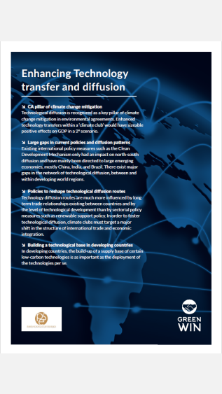 Technological diffusion is recognized as a key pillar of climate change mitigation in environmental agreements. This policy brief, Enhancing Technology Transfer and Diffusion, published as part of the Green-Win project, finds that enhanced technology transfers within a ‘climate club’ would have sizeable positive effects on GDP in a 2° scenario. Existing international policy measures such as the Clean Development Mechanism only had an impact on north-south diffusion and have mainly been directed to large emerging economies, mostly China, India, and Brazil. There exist major gaps in the network of technological diffusion, between and within developing world regions. Technology diffusion routes are much more influenced by long-term trade relationships existing between countries and by the level of technological development than by sectorial policy measures such as renewable support policy. In order to foster technological diffusion, climate clubs must target a major shift in the structure of international trade and economic integration.