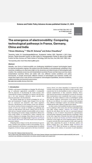 Globally, new forms of electromobility are challenging established transport technologies based on internal combustion engines. The authors explore how this transition is simultaneously unfolding in four countries, enabling them to shed some light on the dynamics and determinants of technological path creation. The paper's analysis covers two old industrialized countries (France and Germany) and two newly industrialized countries (China and India) with very different market conditions and policy frameworks. It reveals enormously different choices of technologies and business models and traces them back to four main drivers of divergence: technological capabilities, demand conditions, political priorities and economic governance.